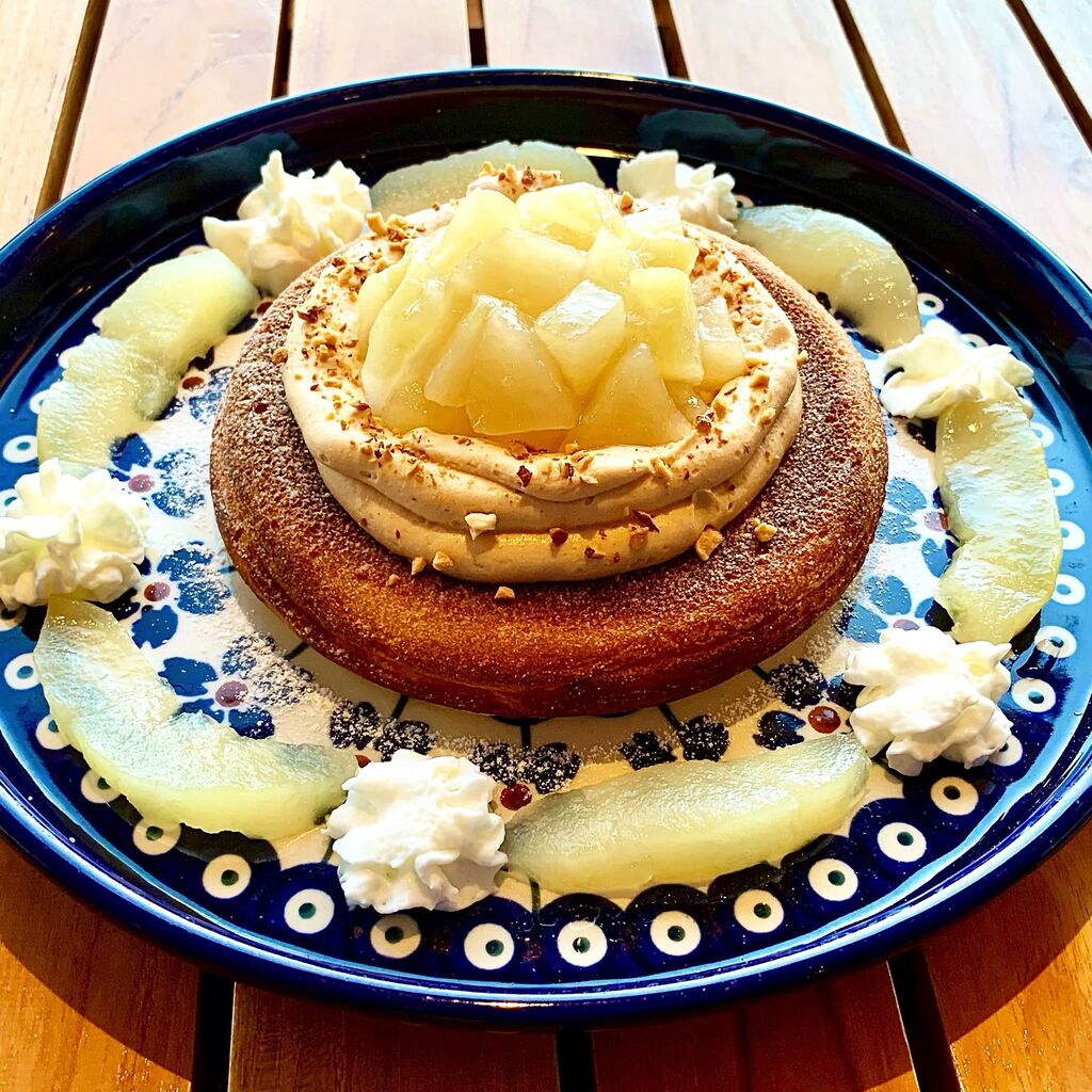 @cafe_ts_plus季節限定洋梨(ラフランス)のパンケーキ自家製洋梨のコンポートカスタードクリームキャラメルクリームもっともっと食べたくなる🤤絶妙なバランスを是非!