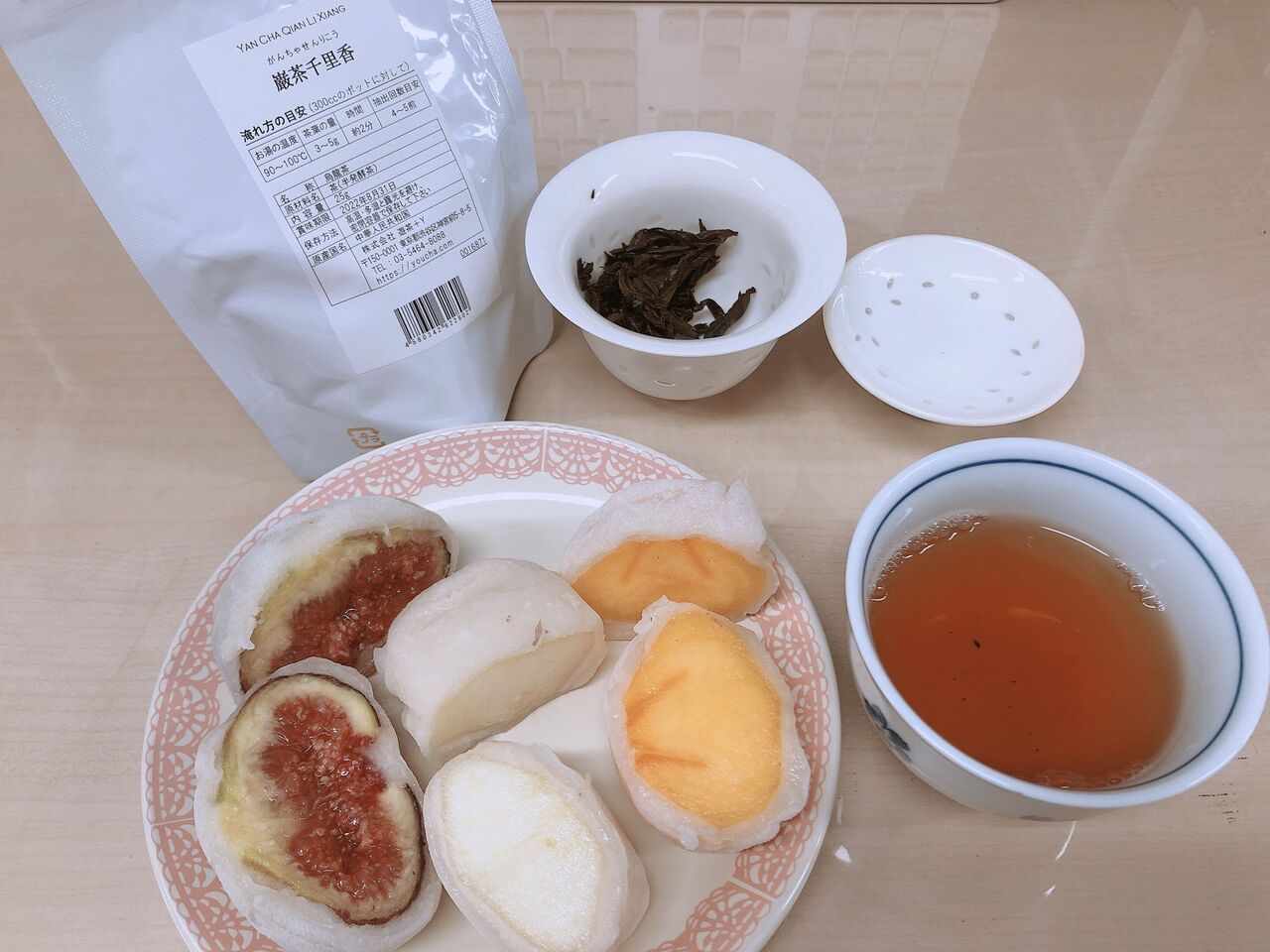 @mdw_弁才天のフルーツ大福(無花果、ラフランス、柿)に岩茶千里香。ペアリングでパッと思いついたのはキームン(会社になかった)。白芽奇蘭も考えたけど、無花果のまったり感に負けるかな?どうかな?と思って岩茶に〜うん合う🥰
