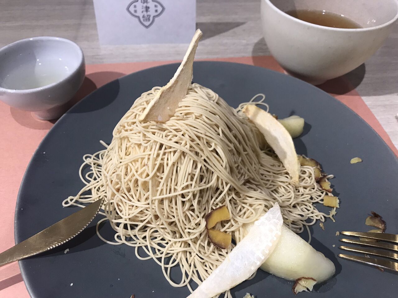 @naoppe108眞津留の錦糸モンブランとほうじ茶。合間に梅昆布茶。ラフランスチップもトロっトロのラフランスとモンブランとのマリアージュ🥰あぁ薔薇色の人生ですな。