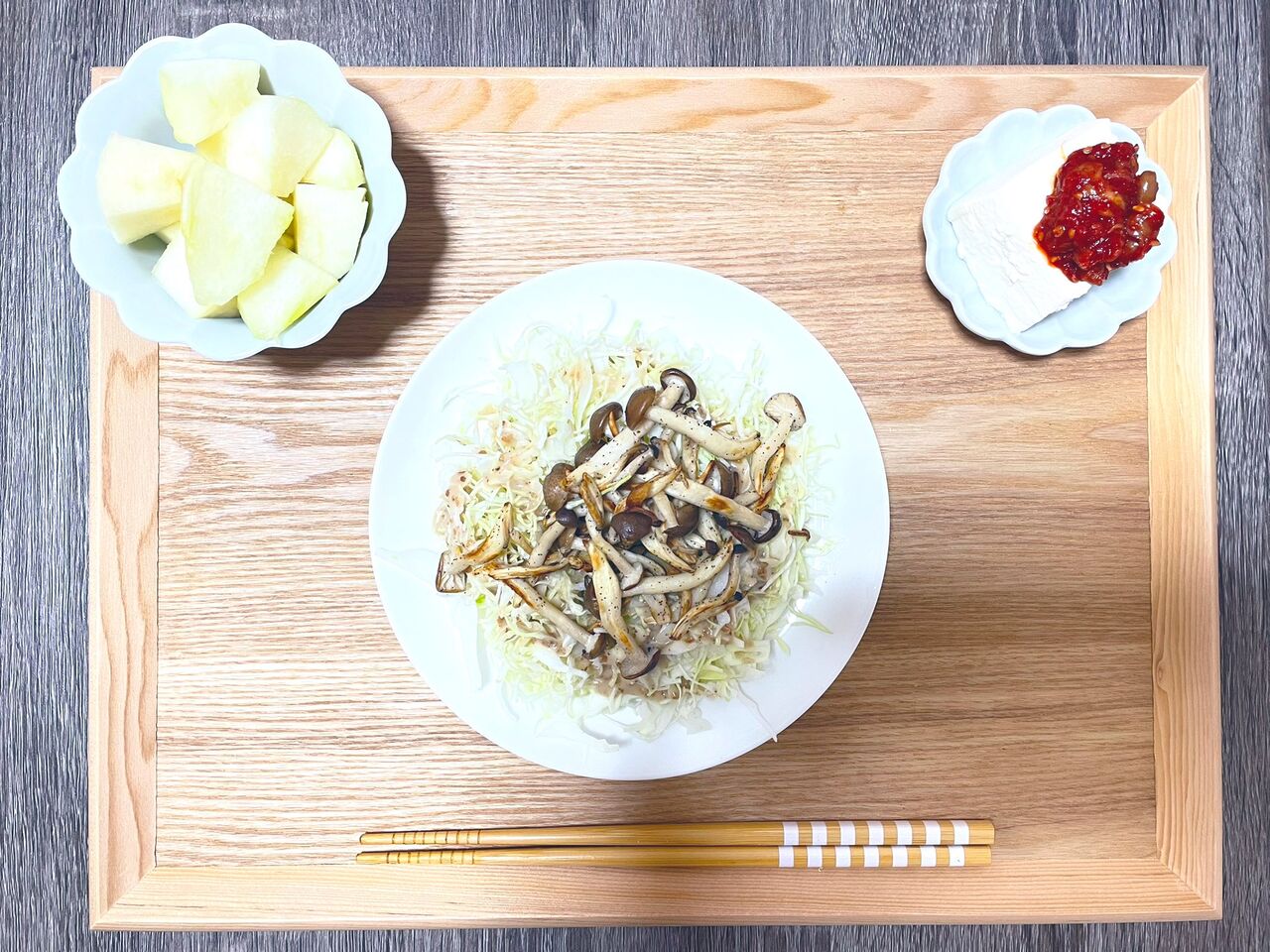 @151cm11キノコと千切りキャベツのサラダ、豆腐、チャンジャ、ラフランス