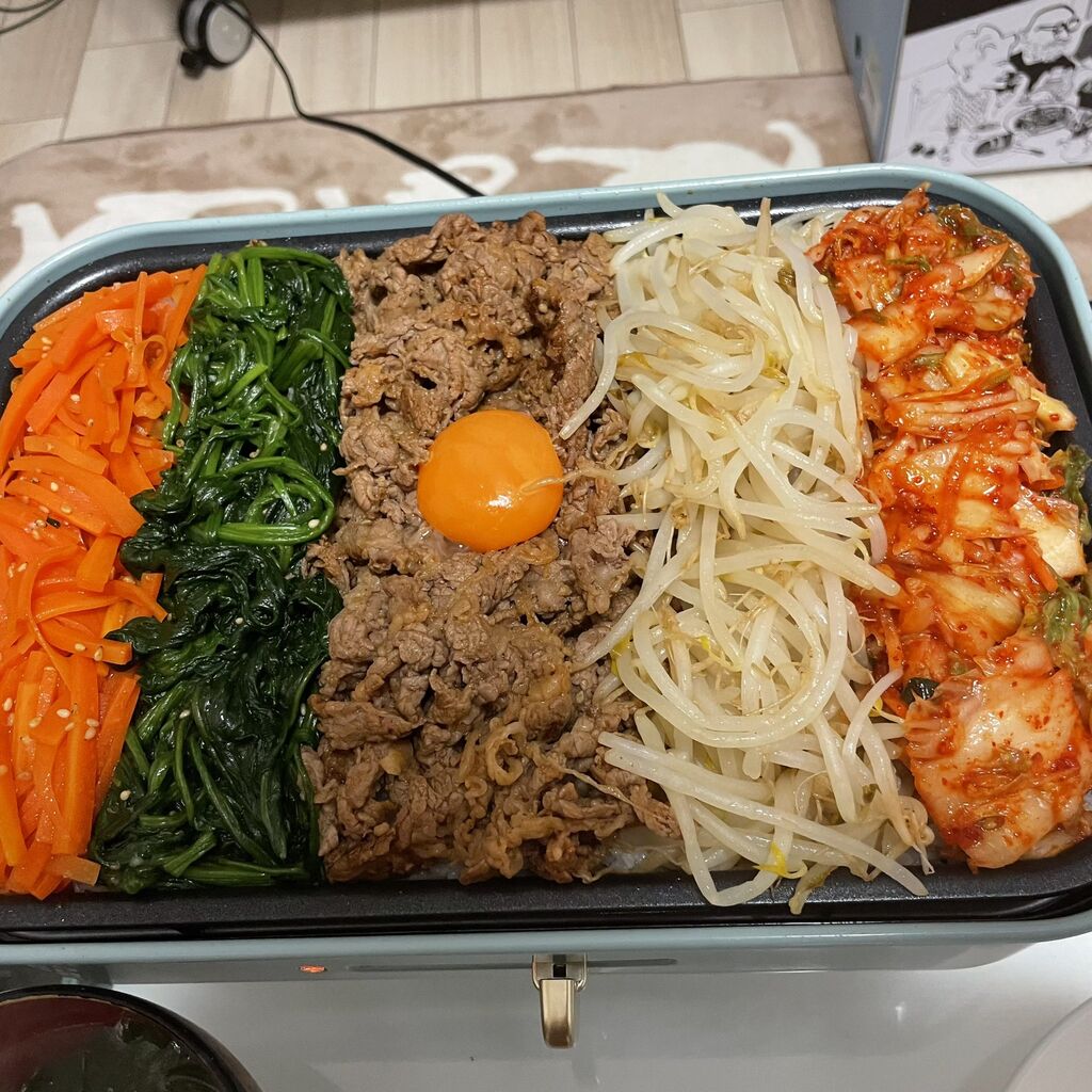 @tare0214昨日の夜のご馳走様😋ホットプレートでビビンバ!!