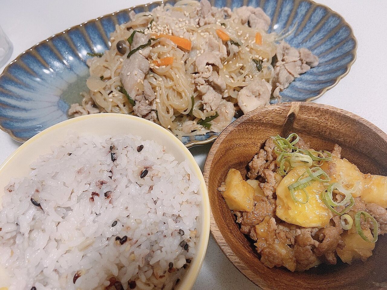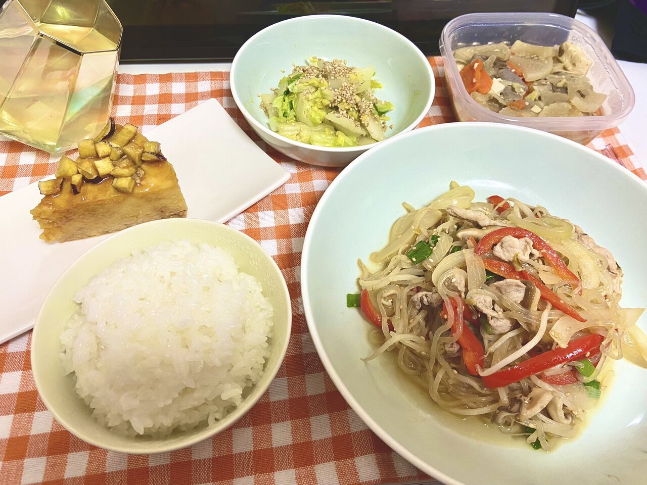 @kinka82今日の晩ご飯しらたきチャプチェ白菜のおひたし煮物みたいになった2日めの豚汁ご飯おやつに芋タルト