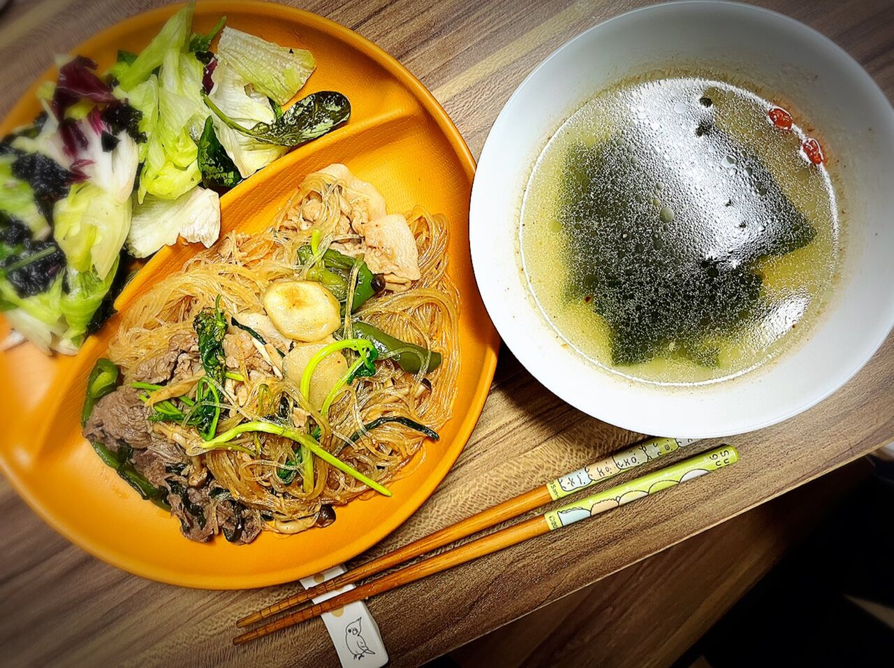 @Takasaki_Ayaneこの日はチャプチェ、チョレギサラダにわかめスープー👍チャプチェはパクチーと菊芋、しめじをいれてささーっとジンギスカンのタレで炒めて簡単に出来ましたよ🤣スープに浮いてるのはクコの実!めっちゃ美味しかった🤤 #たかさきのごはん