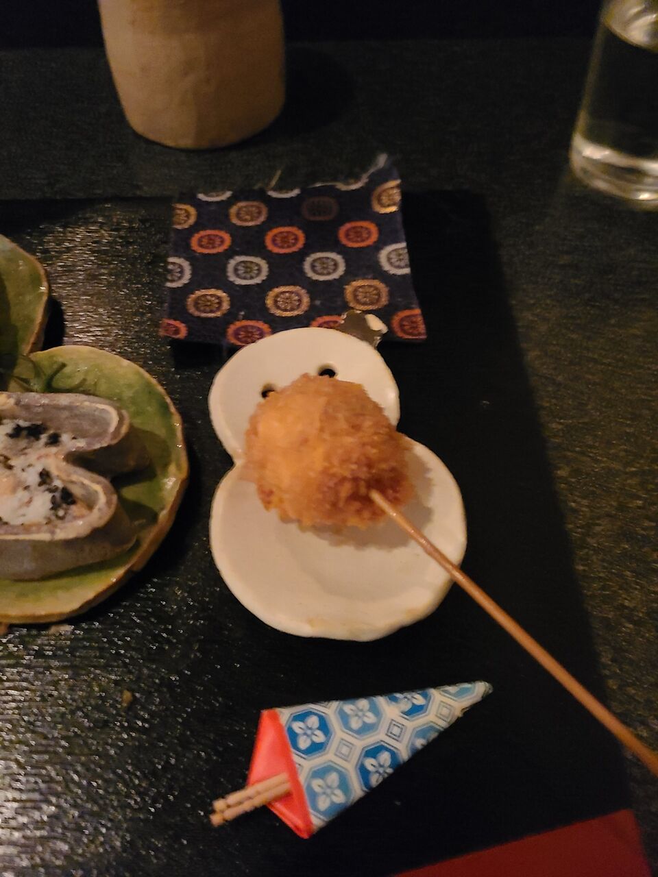 @KWVsQXsqgHUVYChペコロス明太子蓮根の肉詰め酒は旦今は義侠はるか野菜スティック美味、おかわり😁#串揚げ#西陣