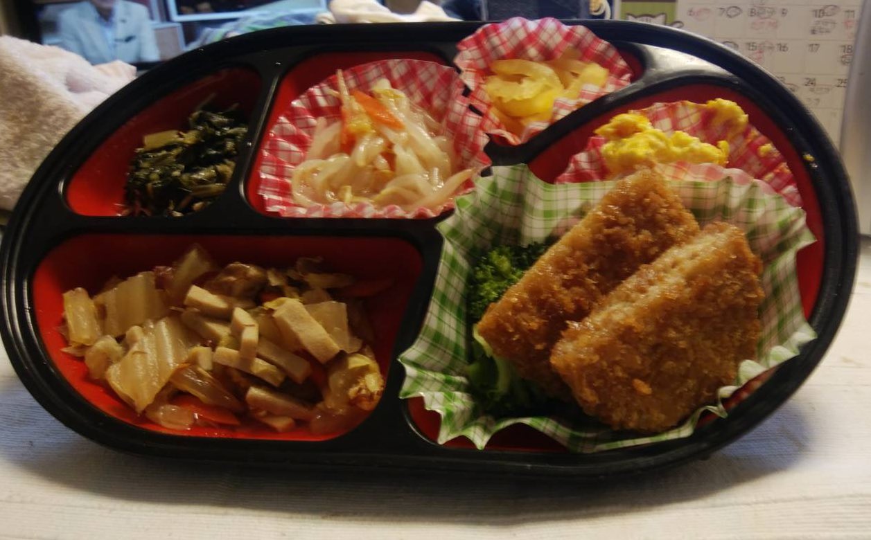 @taka436787593月23日(水)(娘2号が代理投稿)メンチカツ・温野菜添え、白菜と高野豆腐の煮物、もやしの柑橘風味和え、大根葉の炒め煮、カボチャサラダ、お漬物。#夕食宅配 #宅配夕食 #生協 #コープ宅配