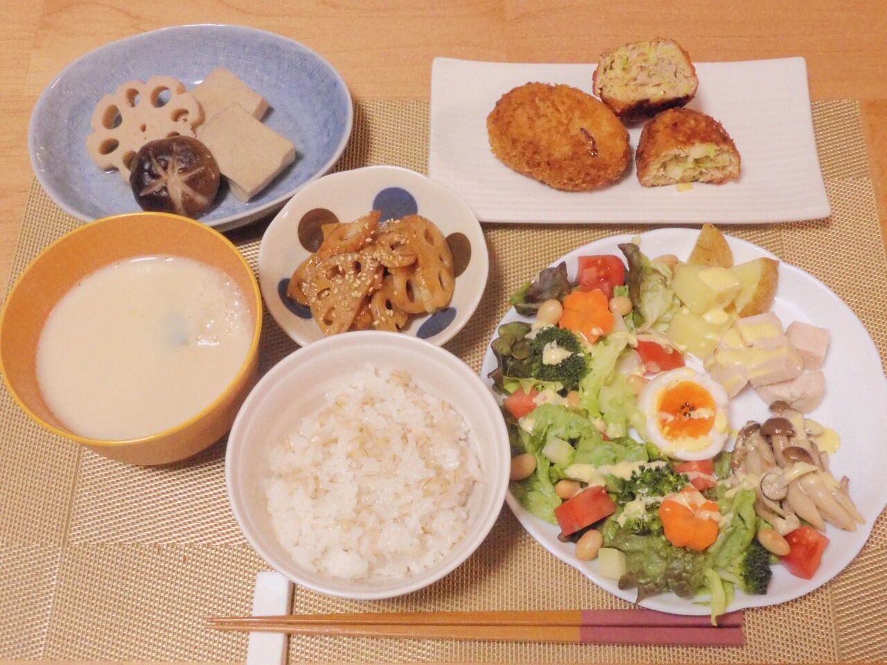 @akun9494今晩のメニュー👩🏻🍳✔︎ペイザンヌサラダ✔︎紅生姜入りキャベツのメンチカツ✔︎ちくわと蓮根のきんぴら✔︎高野豆腐・椎茸・蓮根の煮物✔︎端切れ野菜の豆乳味噌汁✔︎もち麦ごはんいっただきまーす✨🙋♂️