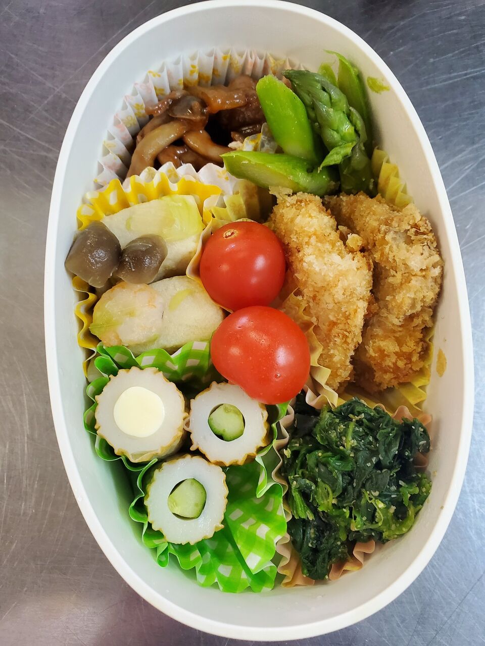 @tarutaru_ikaお弁当の記録を撮ることにした。何を作ったか忘れてしまうんだよね~一口カツ、鶏肉のワインケチャップ煮、高野豆腐のエビ煮、ほうれん草のごま和え