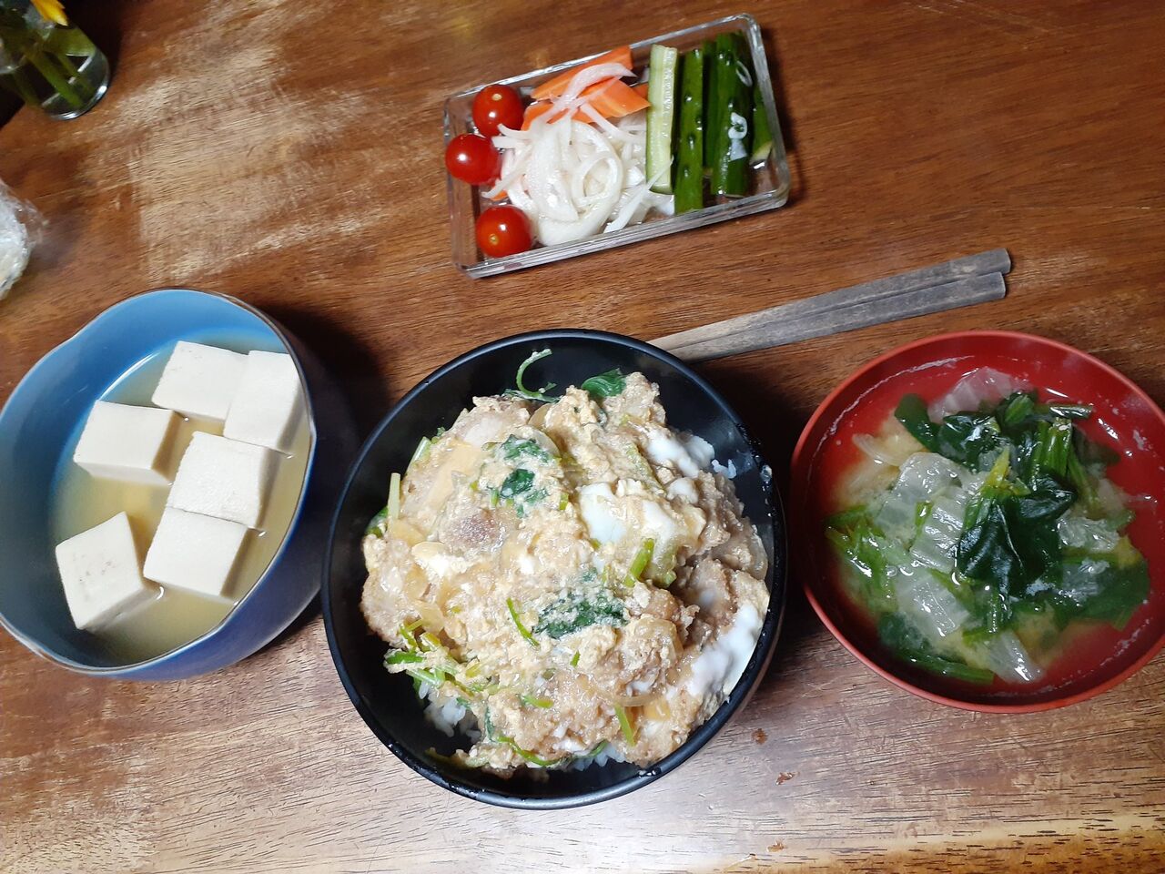 @kennyitch厨房佐々木🐒本日は、カツ丼、高野豆腐、ピクルス、白菜とほうれん草の味噌汁、です。疲れているので、疲労回復メニュー。