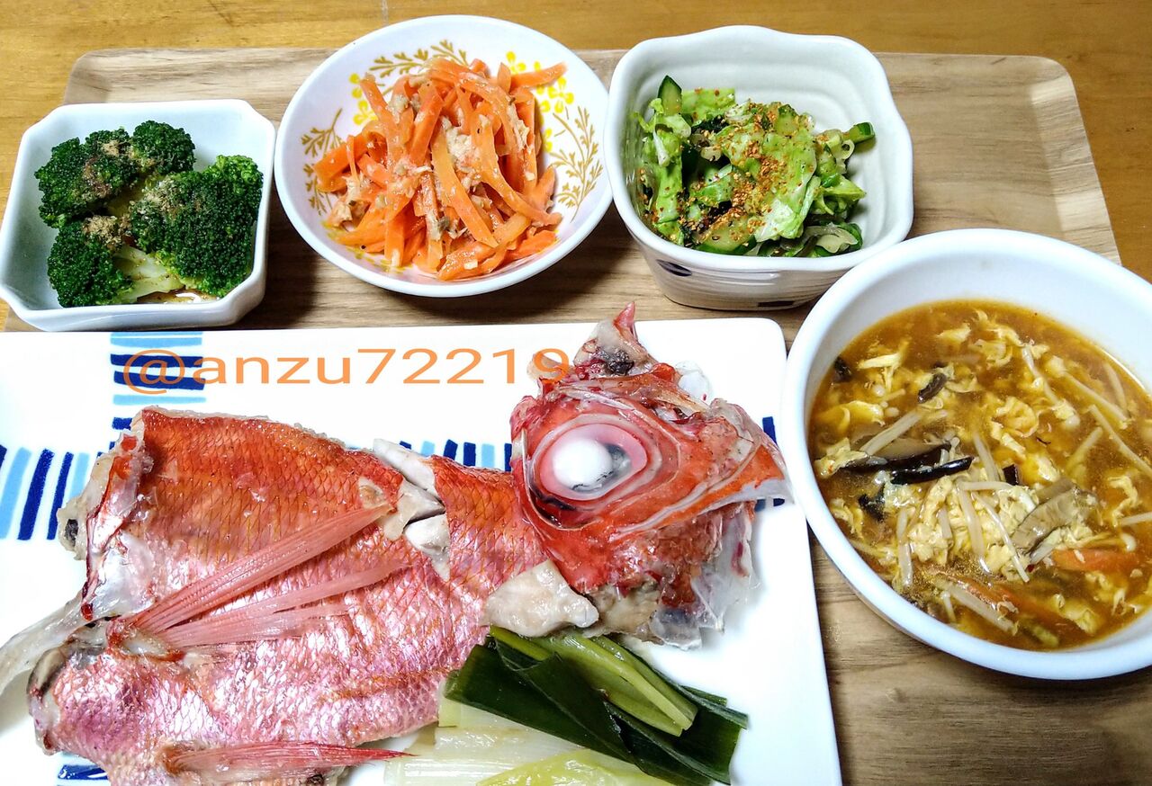 @anzu72219今日の夜ごはんは大好きな金目鯛の煮付け♡野菜不足解消メニュー#おうちごはん #夜ごはん #夕食 #金目鯛の煮付け #酸辣湯 #サンラータン #人参ラペ #浅漬け #ブロッコリーのおひたし