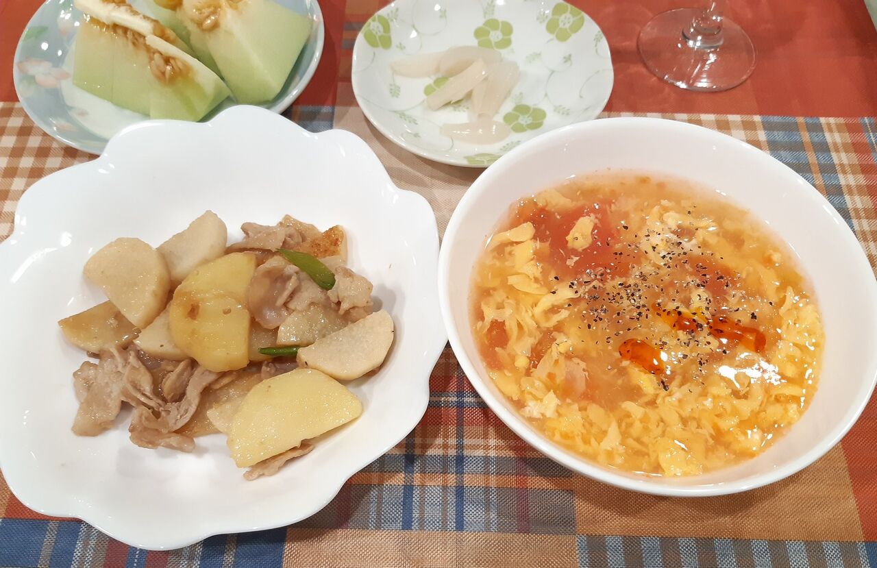 @yattermakio豚バラとじゃがいも長芋甘辛炒め+トマトと玉子のサンラータン風🍅🥚ラー油と黒胡椒入れまくる