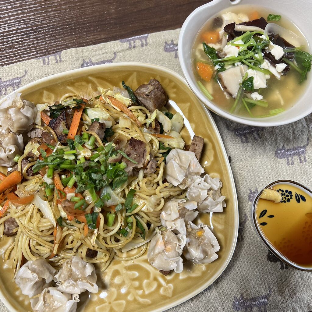 @izunebinゆで豚の塩焼きそばとチーズしゅうまい、ゆで汁でサンラータン、こんにゃくごま味噌和えです♪最近こんなに食べてもお腹すく…#おうちごはん#料理好きさんと繋がりたい #自炊記録#晩ごはん#作り置き