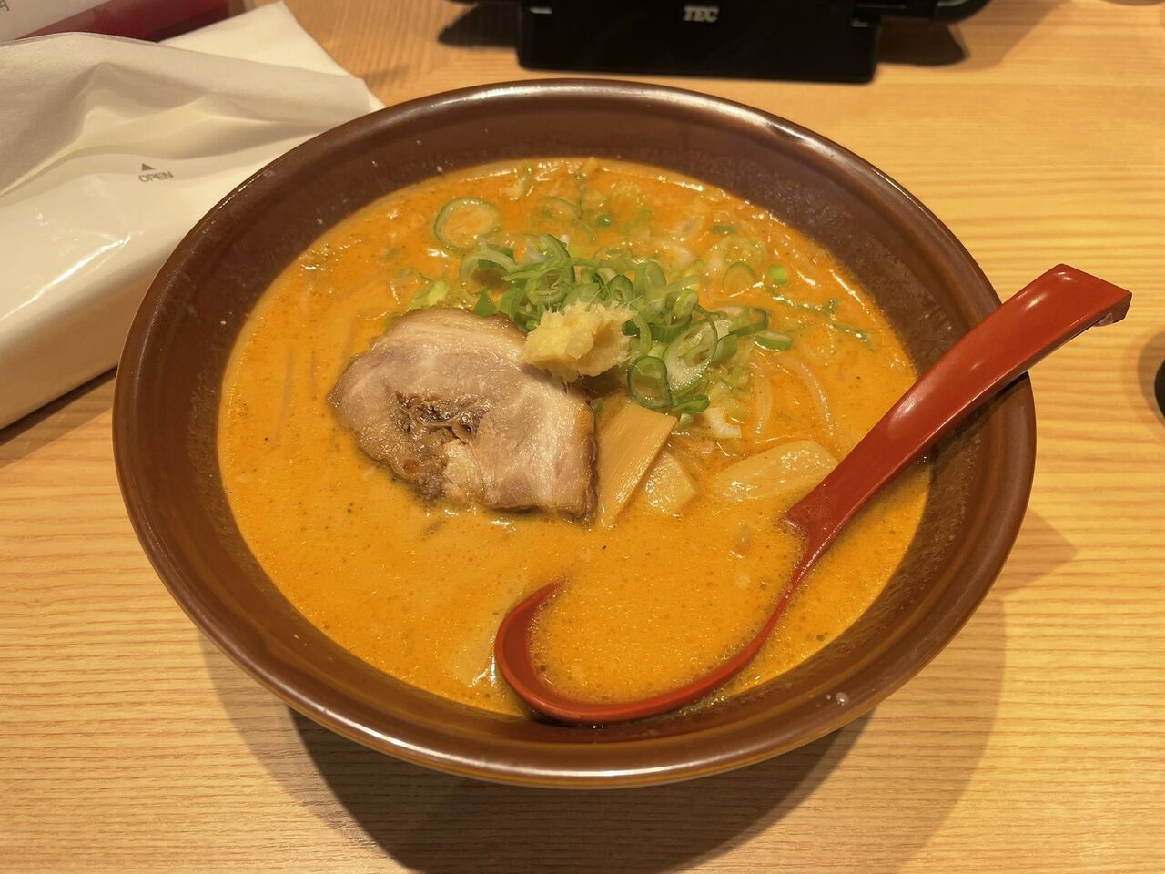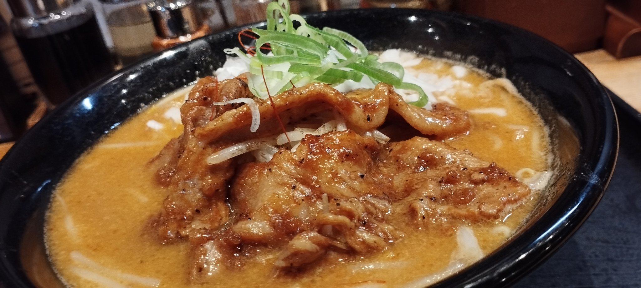 @niheitarou仙台泉の「五福星(ウーフーシン)」にて、ねぎバカラーメン。九条ネギをたっぷり入れた濃いめの味噌ラーメン。主役は九条ネギ。ロースト豚肉もなかなかに旨い。麺は平打ちのシルク麺。味変用のハバネロ?らしきソースをいただいたが辛すぎてぶっ飛… https://t.co/bu5svaigZu