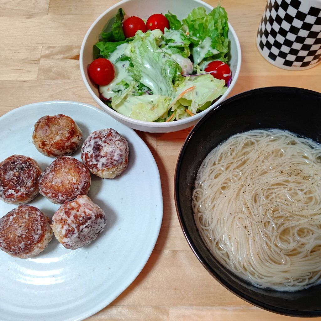 @tatukozuhanohi今日の夕御飯関西風シュウマイ、キムチきゅり、生姜スープ、唐揚げ、サラダ🥗#本日の夕飯