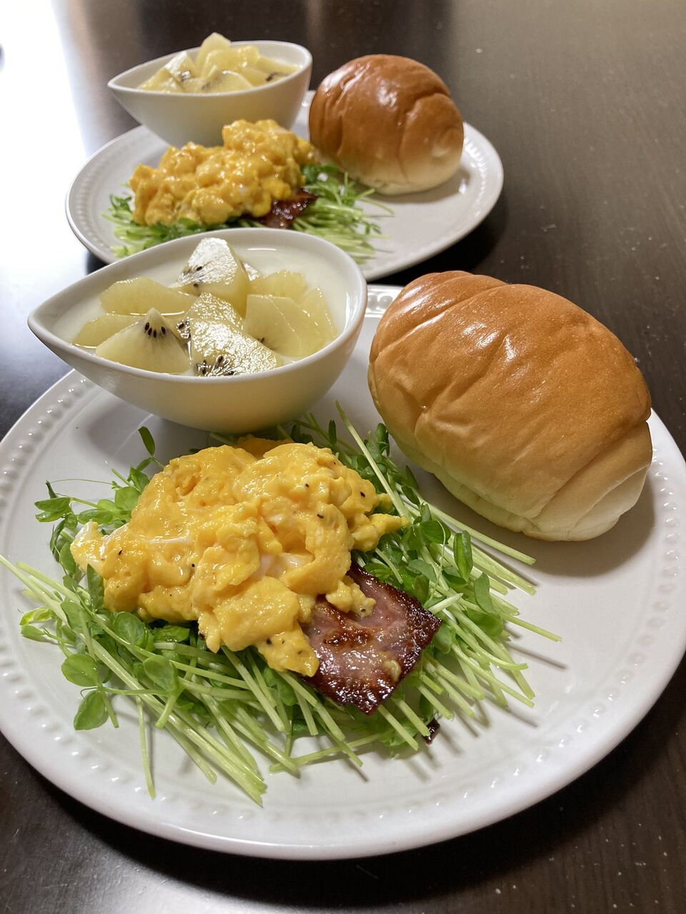 @ayarin_0509スクランブルエッグベーコン、豆苗とともに美味しくいただきました😊#おうちごはん#朝ごはん