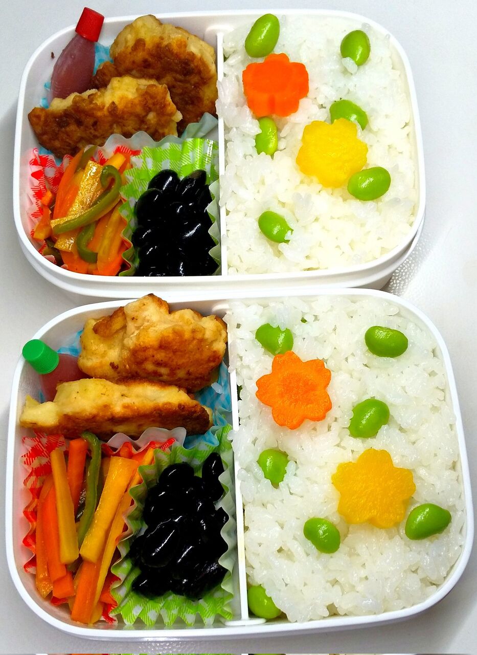 @Kyouren77娘1号と2号の今日のお弁当・豆ご飯・人参の煮物・オニポテチキン・人参とピーマンの中華風きんぴら・黒豆豆豆しいお弁当だけど娘達豆好きだから良いだろう#お弁当#お弁当記録